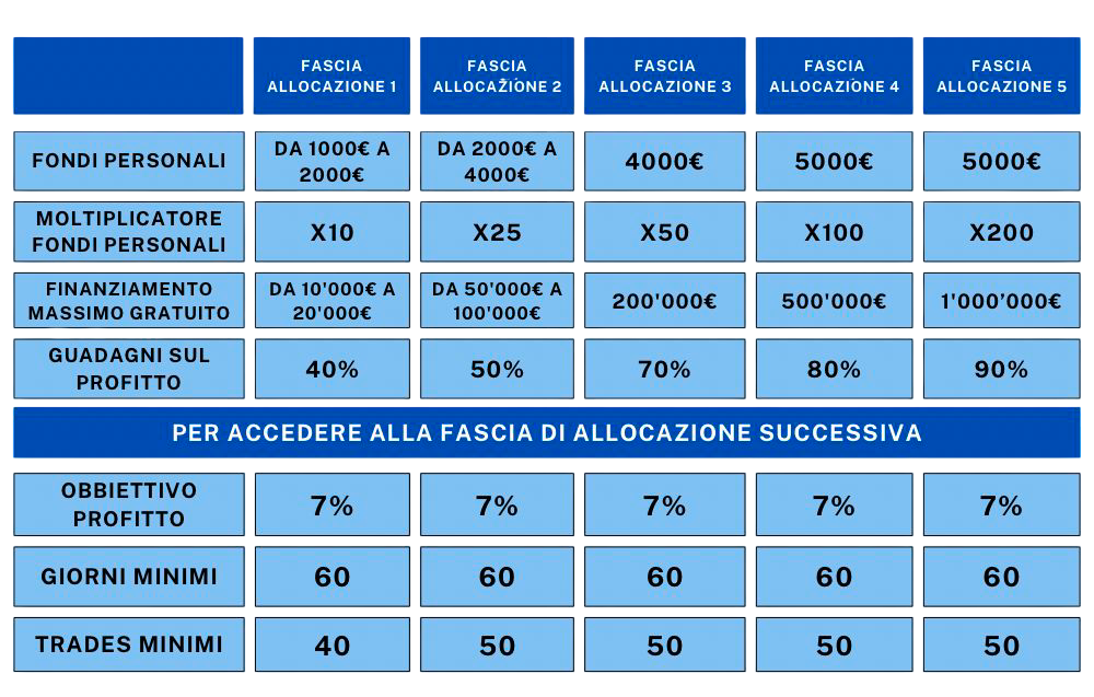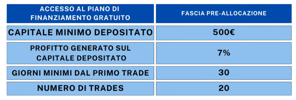 I Fondi Gratuiti non sono soggetti a regole e challenges insidiose, ma vengono sbloccati mese per mese ed iniettati sul conto in modo uguale per ogni nuovo utente, che potrà gestirli semplicemente tradando sul suo conto di trading personale. La tabella in basso mostra come i fondi vengono allocati gratuitamente.